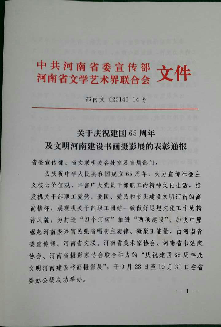 關于慶祝建國65周年 及文明河南建設書畫攝影展的表彰通報