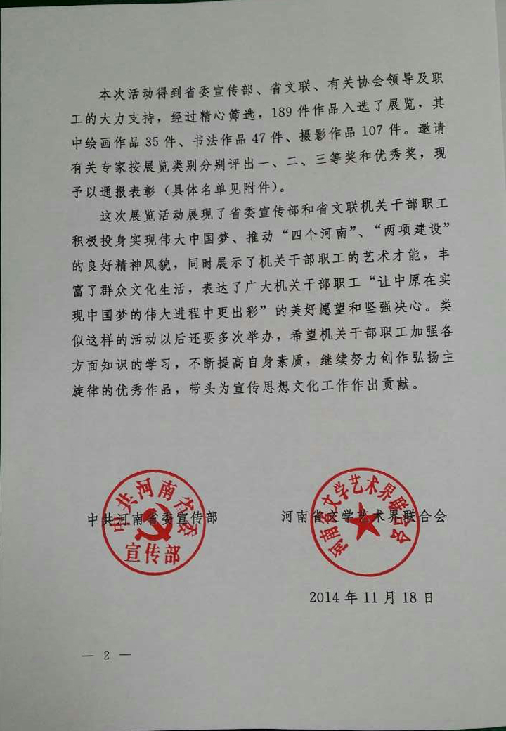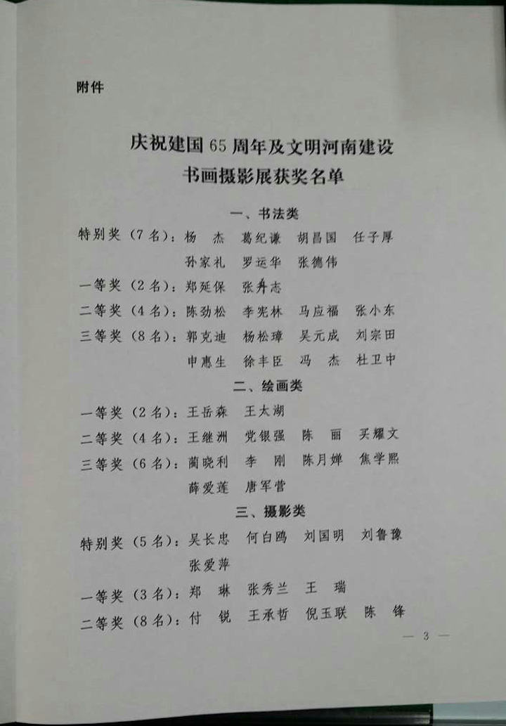 慶祝建國65周年及文明河南建設書畫攝影展獲獎名單